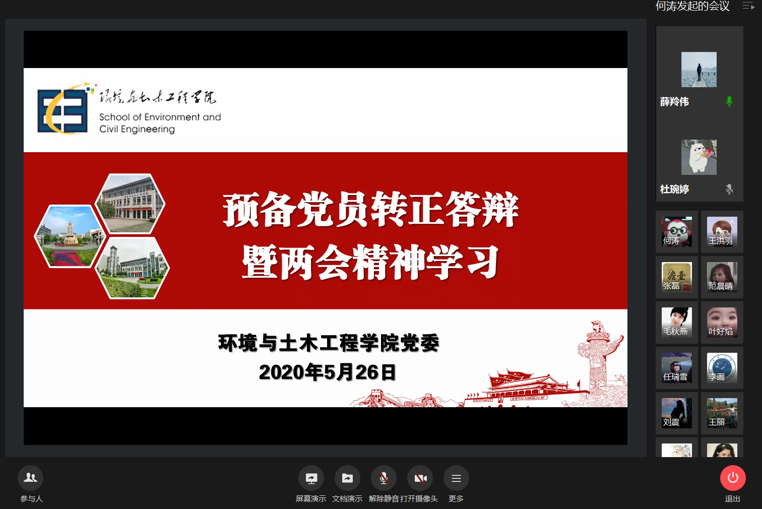 为进一步完善学生预备党员考察机制,促进学生党员学习两会精神,切实发挥学生党员先锋模范作用,环境与土木工程学院党委举行本学期预备党员转正答辩暨两会精神学习会。院党委副书记兼副院长金明媚,学工办主任蒋达锋,院党委秘书沈炎,辅导员周佳赟、薛羚伟担任答辩评委,本科生、研究生各支部党员参加会议。本次会议以线上形式开展,由辅导员何涛主持。