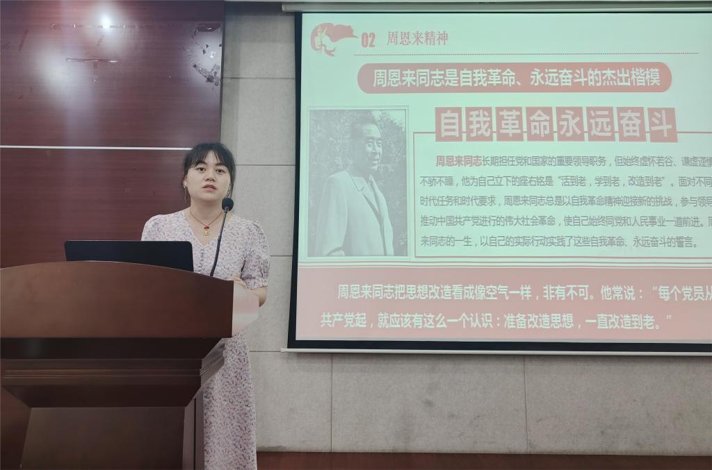 会议首先由胡娟领学,开展了以“坚定不移全面从严治党,深入推进新时代党的建设新的伟大工程”为主题的理论学习。胡娟深刻阐释了全面从严治党的基本内涵与本质,并强调全面从严治党是对马克思主义党建理论和实践的丰富发展,为中国特色社会主义事业的发展提供了坚强保证,全面从严治党永远在路上。随后,周佳赟带领全体党员开展了有关“周恩来精神”的专题教育。她讲述了周恩来自踏上革命道路起伟大的一生,指出了周恩来精神“全心全意为人民服务”的核心与科学内涵,并强调青年党员应充分学习周恩来的楷模精神,汲取磅礴能量,勇担时代使命,在新时代坚持和发展中国特色社会主义征程上奋勇前进。
