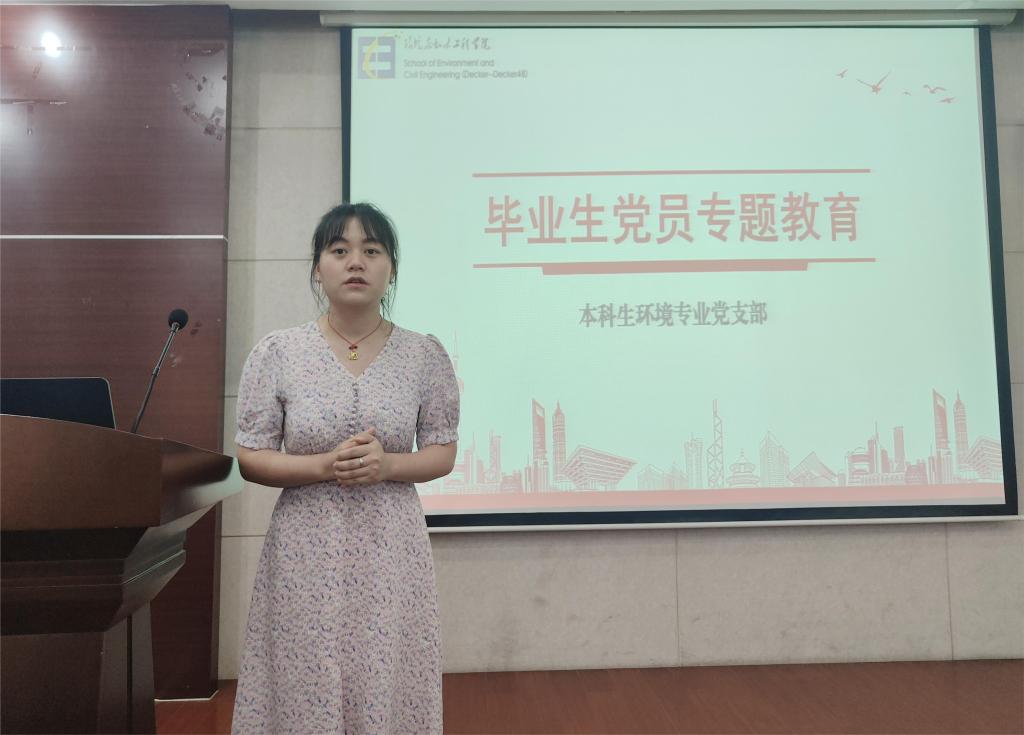 6月1日,环境与土木工程学院本科生环境专业党支部在D303会议室组织开展了“学悟新思想,奋斗正青春”本科生党员专题教育,并召开了2023上半年党员发展会议。环境与土木工程学院党委副书记兼副院长胡娟、本科生环境专业党支部书记周佳赟、支部委员李东辉以及支部全体党员参加会议。会议由周佳赟主持。