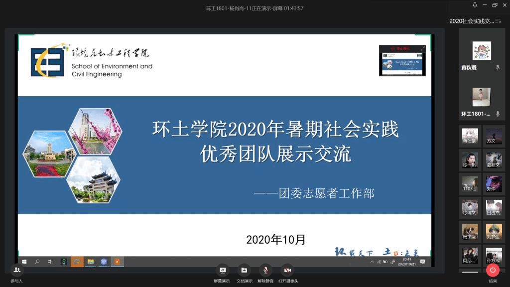 20级新生分享了各自团队对于疫情期间各行各业的奉献、疫情对于建筑行业的影响、“三下乡”社会实践活动的研究过程和成果经验。