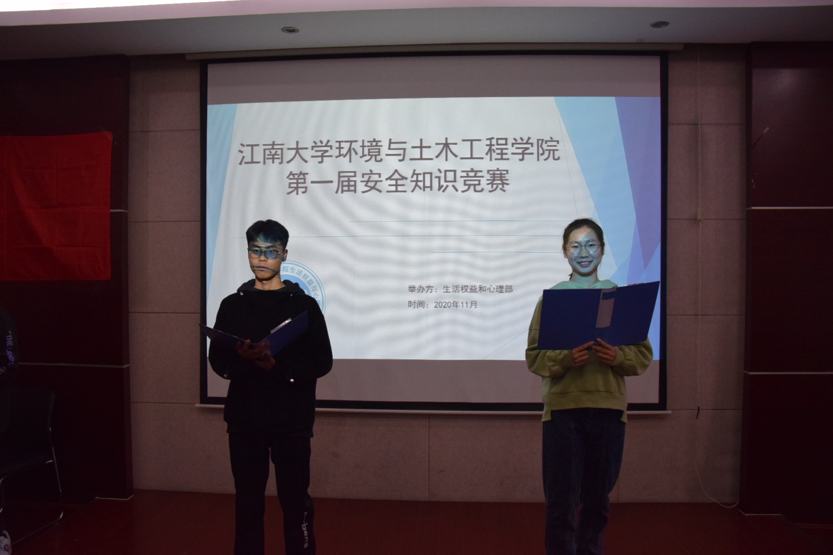 本次比赛由环境与土木工程学院学生会主办,生活权益与心理部承办,徐明悦和刘节同学主持。2020级每班各派出4名选手参加比赛,各班安全委员、观众代表观摩了本次比赛。