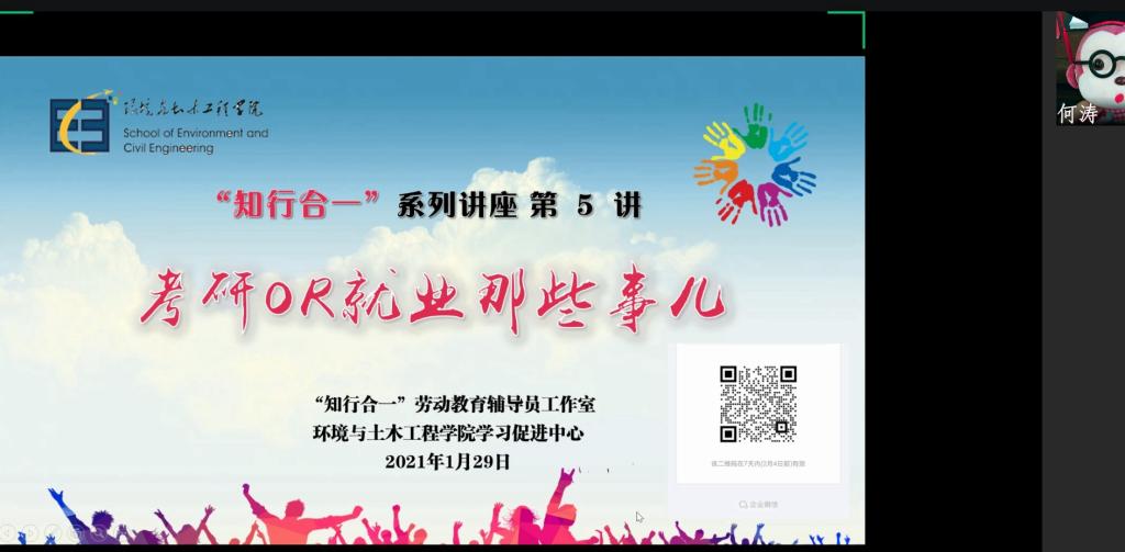 环境与土木工程学院利用线上平台召开2022届毕业生考研就业动员大会暨“知行合一”系列讲座第5讲——考研OR就业那些事儿,帮助同学们尽快明确未来规划。本次讲座由学院团委书记周佳赟主持,土木工程专业辅导员何涛主讲,2018级全体本科生参与。