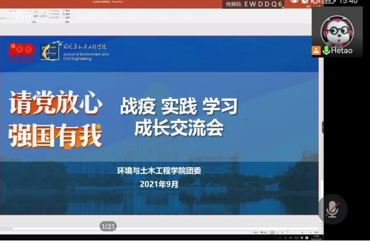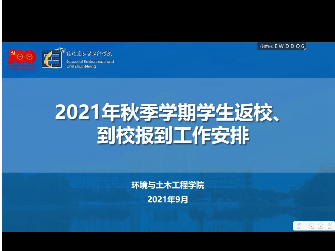 9月24日,环境与土木工程学院召开2021-2022学年学生返校(到校)报到工作布置会。学院团委书记兼学工办主任、研究生辅导员周佳赟,本科生辅导员薛羚伟、何涛分别为各年级学生做工作布置,各年级学生线上参会。
