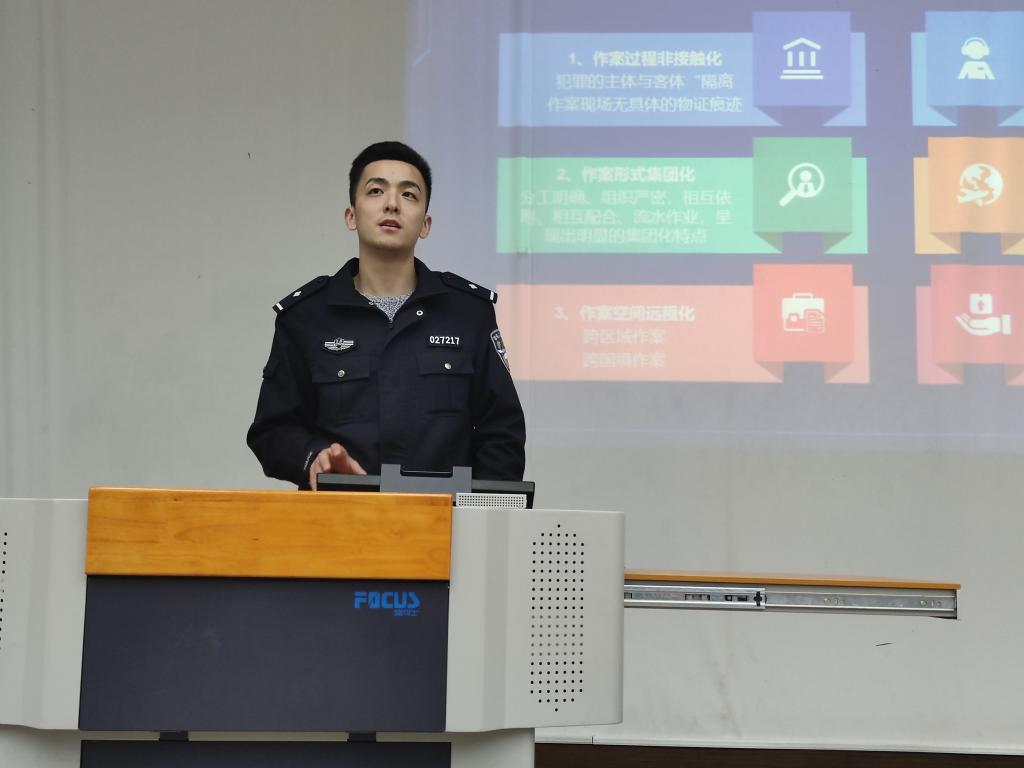 以及邻校的多起典型案例,王警官用一个个鲜活的事例,生动形象的展现了诈骗分子的狡猾和无孔不入,为在座的同学敲响警钟。其后,王警官将容易发生在大学生身上的诈骗类型进行了系统分类,如网购退款类,游戏装备交易类,网上交友类,逐一介绍其作案手法,他告诫同学们不要轻易相信任何天降的福利和陌生的信息。