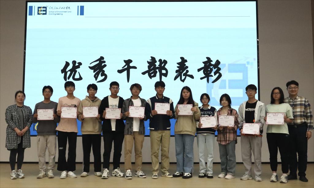 薛羚伟宣读《关于表彰2022-2023学年环境与土木工程学院优秀学生干部、优秀干事、优秀团学组织部门的决定》。 胡娟、薛羚伟为受表彰个人和部门颁发证书和奖励。