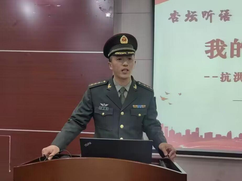 随后,冒小驰连长现身说法,用铿锵有力的声音为学员们真诚地讲述抗洪故事。在2020年7月22日上午,安徽省庐江县白石天河石大圩段突发决口险情,危急关头之时,他与27名战友组成了党员突击队,在湍急的洪水中组成人墙,转移群众。作为值班员,他把自己安排在了水流最急的地方,而处在最危险位置的他不幸被洪水卷走,卷入漩涡。经过战友们奋不顾身的抢救,在亲人朋友,医生护士的不懈努力和关心下,与死神擦肩而过,身体情况逐渐好转,因其在抗洪救灾中的突出贡献荣立个人二等功。