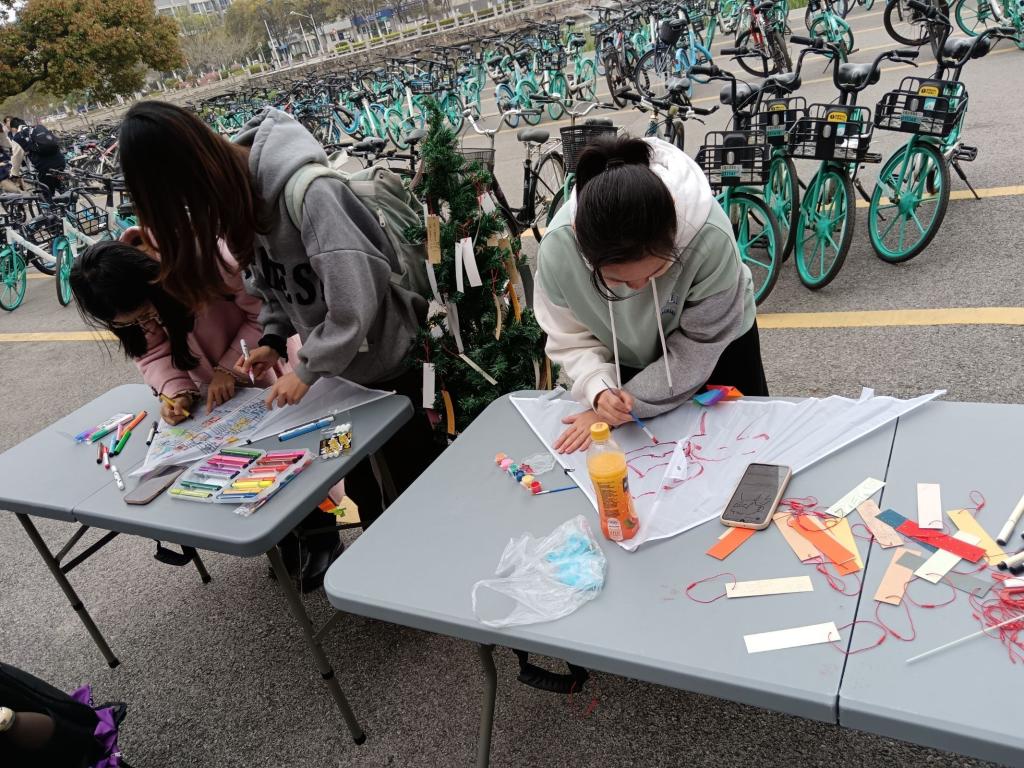 举办的“环护童心,益童前行”爱心活动在学校一食堂旁的空地上热烈举行。本次活动吸引了众多学生的积极参与,旨在通过写祝福语、绘制风筝和风车等方式,为山区儿童送去关爱与温暖。