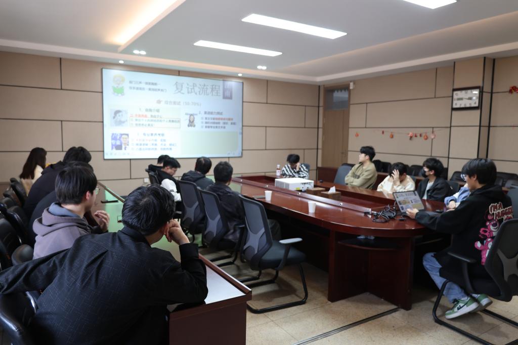 紧接着,丁国庆和黄天乐两位学长登上讲台,分享起自己去年备战考研复试的心路历程。丁国庆学长着重讲述了如何在短时间内高效复习专业课,如何整理笔记、梳理知识框架,以及如何通过模拟面试锻炼自己的表达能力。黄天乐学长则侧重于英语复试的准备,从词汇积累、口语练习到英文自我介绍的撰写,每一个细节都毫不保留地传授给师弟师妹们。