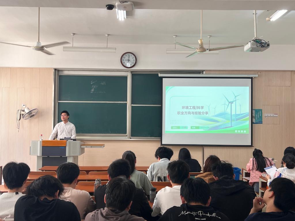 于1A216成功举办“职来值往”主题讲座,本次的主题是“环境工程/科学职业方向与经验分享”。本次讲座特邀就职于无锡市梁溪生态环境局的学院杰出校友沈鹏主讲。