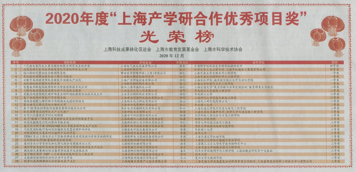 2020年12月17日, 2020年“上海市产学研合作优秀项目奖”表彰大会在上海市政协礼堂隆重举行。上海市政协主席董云虎、常委副市长吴清等多名领导出席了颁奖仪式。
