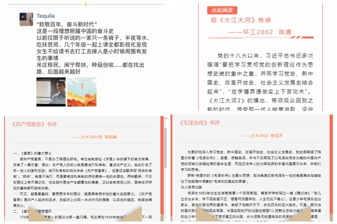 “回望百年,品读青春”,书评创作写青春。引导全体学生阅读《共产党宣言》《毛泽东选集》 《毛泽东文集》《习近平谈治国理政(一至三卷)》《习近平的七年知青岁月》等推荐书目,让学生们在在书页间回望百年历史,于经典中品读青春韶华,一字一句写下对党的深情,一言一语记下青年人的所思所想。