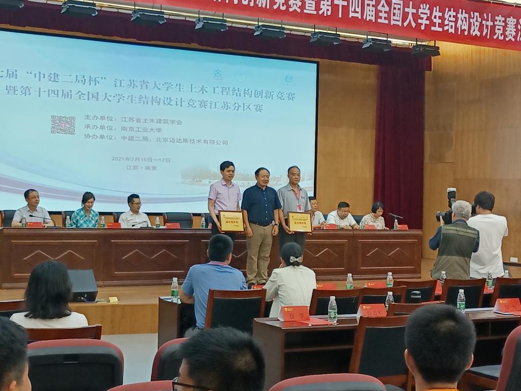 7月15-17日,第十七届“中建二局杯”江苏省大学生土木工程结构创新竞赛暨第十四届全国大学生结构设计竞赛江苏分区赛在南京工业大学举行。我校参赛队伍由环境与土木工程学院王登峰、付李、成虎老师带队,华渊教授作为特邀评委,共斩获特等奖、一等奖和二等奖各1项。鉴于我校参赛学子的优秀表现,我校与主办方南京工业大学荣获江苏省土木建筑学会颁发的最佳组织奖。