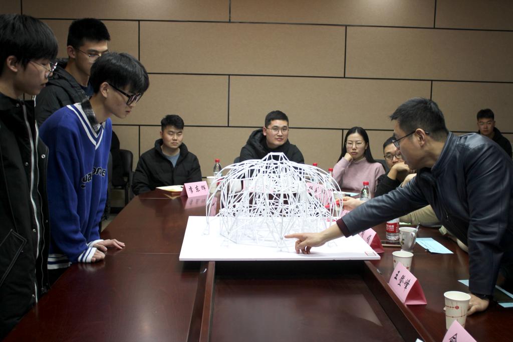 主持人首先介绍了比赛流程和评分细则。决赛采用团队展示与答辩相结合的方式,每组团队进行3分钟模型构造设计展示,阐述建筑模型设计理念、模型结构介绍等。接着由每组团队的三位代表进行答辩,评委对每个模型的制作工艺、力学原理、实际应用、材料环保性进行多方面综合考量,并对选手进行现场提问,指出各个结构的优势和存在的不足。