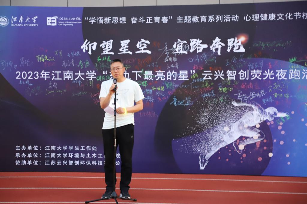 宜兴研究生院管理办公室主任杨延在现场作动员讲话,他强调荧光夜跑不是一场竞赛,没有排名和速度的竞争,希望大家能在过程中感受到东氿独特的魅力、享受运动的乐趣,将健康生活的理念传递给身边的每一个人。