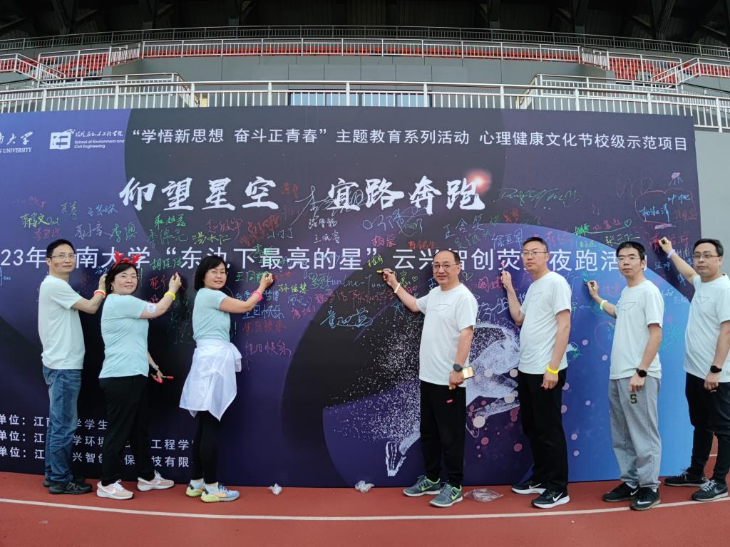 “东氿下最亮的星”荧光夜跑吸引了环境与土木工程学院、设计学院、纺织科学与工程学院、马克思主义学院、人文学院等六个学院近250名学生及20多位校外企业家和外籍友人的参与。