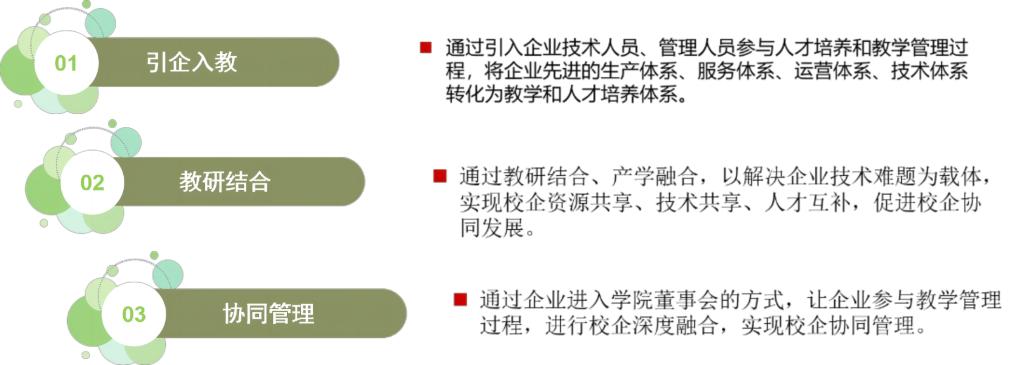 构建“引企入教—教研结合—协同管理”三阶段渐进式校企共生共轭合作模式。引入企业技术和管理人员参与人才培养,将企业先进的生产、服务、运营、技术体系转化为教学和人才培养体系。通过教研结合、产学融合,以解决企业技术难题为载体,实现校企资源共享、技术共享、人才互补,促进校企协同发展。企业进入董事会,参与教学管理,实现校企协同管理。