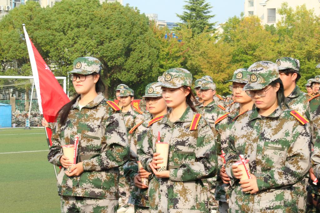 学子的优秀风貌。随后,学院党政领导亲自为“每日军训之星”送上奶茶,领导亲临前线无不体现出学院对学子的关怀和挂念。最后,参会人员进行大合照,剩余同学在教官的指挥下有序领取奶茶,笑容在学子的脸上绽放。