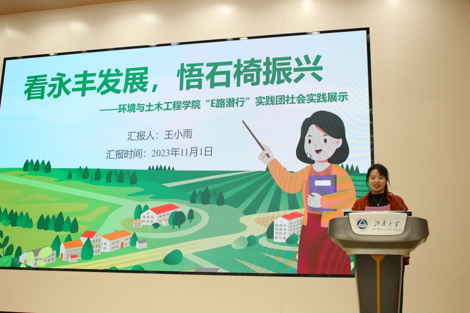 2023年暑期社会实践优秀项目代表王小雨展示奔赴四川眉山市永丰村与绵阳北川石椅的调研实践经历。她感悟到在乡村振兴中,要做到传承与创新并存,自然与科技融合,弘扬抗震救灾精神,共建美丽乡村、美丽中国。大学生双碳科普协会负责人代怡馨回顾总结“E路潜行”生态文明志愿服务团队从成立至今5年多的建设历程,从选择、发展、传承等方面,向我们介绍了大学生双碳科普协会(青年环保学校)的发展理念和志愿服务实践经历,展现环境与土木工程学院学子用青春和汗水奋发向上,勇毅前行的奋斗姿态与优良风貌。