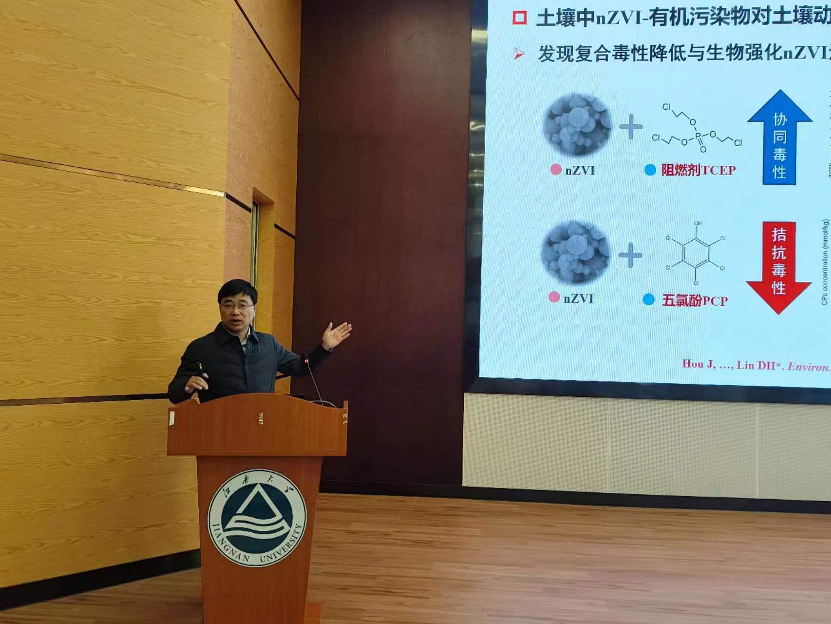 林道辉教授关注土壤污染与修复,提出了化学修复技术与生态自净耦合的新范式—纳米材料-生物协同修复技术。由于纳米材料与污染物复合仍存在暴露风险,因此他研究了纳米材料-污染物复合生物效应,基于纳米材料-生物界面作用设计了协同修复技术。接着林道辉教授分享了纳米材料-污染物的复合毒性机制,重点讲述了纳米零价铁(nZVI)—动物/植物界面作用与协同修复,说明了nZVI—动物界面互作强化降解有机污染物以及nZVI—植物界面互作对土壤污染物协同降解的技术原理、技术进展,最后分享了铁基纳米材料用于镉污染水稻田安全生产的大田应用案例,并进行了总结与展望。