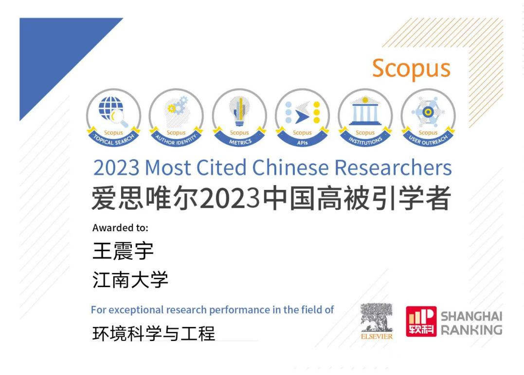 王震宇教授继入选Research.com 2023“全球顶尖科学家榜单”、全球学者库2023“全球学者学术影响力排名(终身学术影响力榜)”名录之后,再次荣登2023“中国高被引学者”榜单。王震宇教授连续四年(2020-2023)入选该高被引学者榜单也标志着我校环境学科的科研水平和影响力逐渐持续提升。