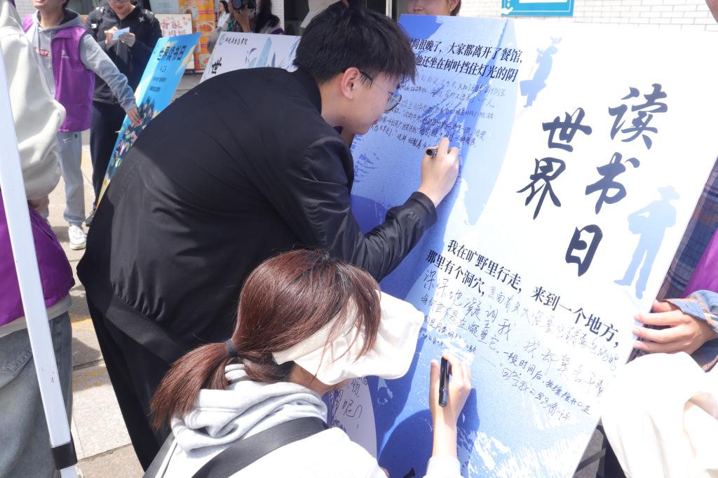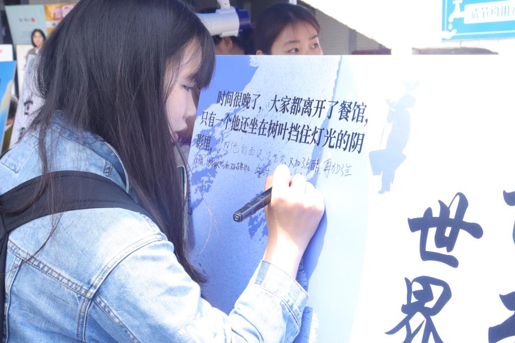 “续写接龙,以文会友”活动需要参与者通过展板上给出的故事开头,展开想象力,接力续写完善故事。同学们执笔挥洒,思维天马行空。有的幽默诙谐,有的哲思深刻,有的志向高远,有的贴近生活,展板装不下同学们的热情。在马克笔的交换间,在人来人往中,三个有趣的故事俨然成型。热烈的讨论声、笔尖的沙沙声交织在一起,构成了一幅充满活力和创造力的画面,让人感受到了文学的魅力和力量!