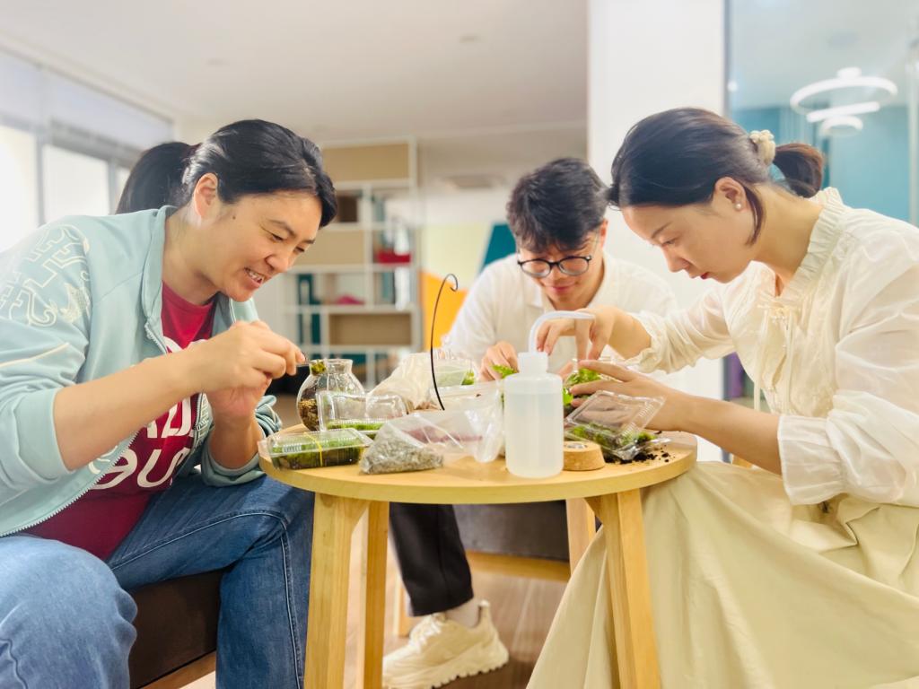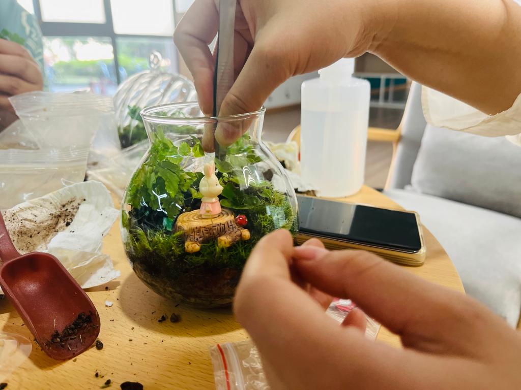 活动当天,工作人员准备了精美玻璃瓶、泥土、轻石、苔藓、蕨类植物等材料,为同学们介绍了土壤生态瓶的制作原理和技巧。在老师们的引导下,同学们在瓶中种植了自己心仪的植物,细心观察和维护植物的生长过程。学生根据生态系统的组成以及各生态系统的结构特点,在瓶中装入水、塘泥、土壤和种植各种微型植物,让生态瓶更加完整,呈现出生机勃勃的景观。一个个充满童话趣味的生态瓶,是每个学生精心设计而成的。小小生态瓶,一瓶一世界,一方一净土,心间花自开。通过这次活动,同学们不仅体验了动手制作的乐趣,还提升了对土壤生态和植物生长的认识,近距离地感受到大自然的无穷魅力。
