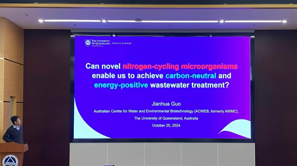 东氿校区钱盘生楼A101举办了2025年第一场“金山·环境大讲堂”讲座。本次讲座邀请了澳大利亚昆士兰大学水中心副主任郭建华教授作为主讲嘉宾,学院教师、研究生等50余人参加了此次讲座活动。讲座由学院陈思思副研究员主持。