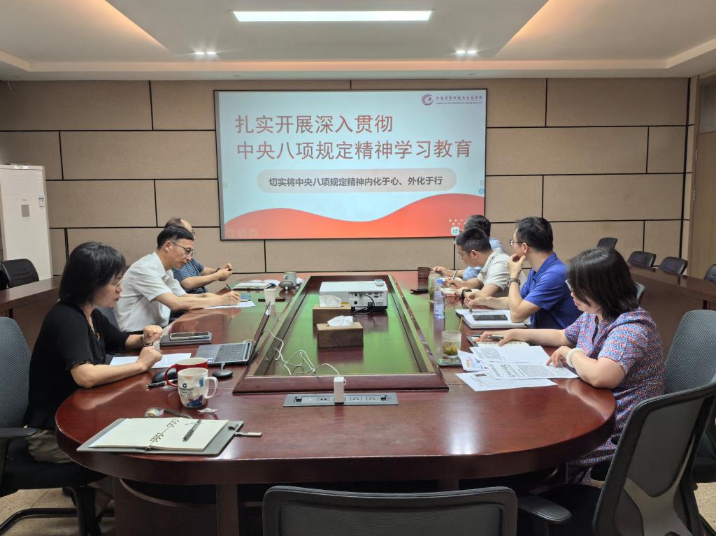 院党委副书记、党委纪检委员胡娟深入剖析了违反中央八项规定精神问题典型案例,并结合案例对学院如何在日常工作中严守纪律底线、规范从政行为提出了明确要求,进一步增强领导班子遵守纪律规定的自觉性和坚定性。在学习讨论环节,学院院长王震宇围绕学习主题作重点发言,结合学院实际工作,就如何将中央八项规定精神落实到教学、科研、管理等各项工作中提出了具体思路和举措,要求大家切实将中央八项规定精神内化于心、外化于行。学院其他领导结合各自分管工作,畅谈了学习体会,表示将在今后的工作中,以身作则,严格遵守中央八项规定精神,为学院师生树立良好榜样。